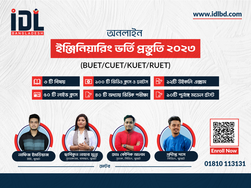 বিজ্ঞান বিভাগে অনলাইন ইঞ্জিনিয়ারিং কোর্স একটি আবশ্যিক বিষয়। দেশের সেরা বুয়েট, রুয়েট, কুয়েট এবং চুয়েট ভর্তির সুযোগ নিশ্চিত করতে প্রয়োজন সুপরিকল্পিত প্রস্তুতি। বুয়েট এবং দেশের প্রথম সারির বিশ্ববিদ্যালয়গুলো থেকে উচ্চতর শিক্ষা সম্পন্ন করা আমাদের অভিজ্ঞ মেন্টররা তোমাদের শেখাবে অল্প সময়ে কিভাবে সব দুর্বলতা কাটিয়ে ভর্তি পরীক্ষায় সফল হওয়া যায়।