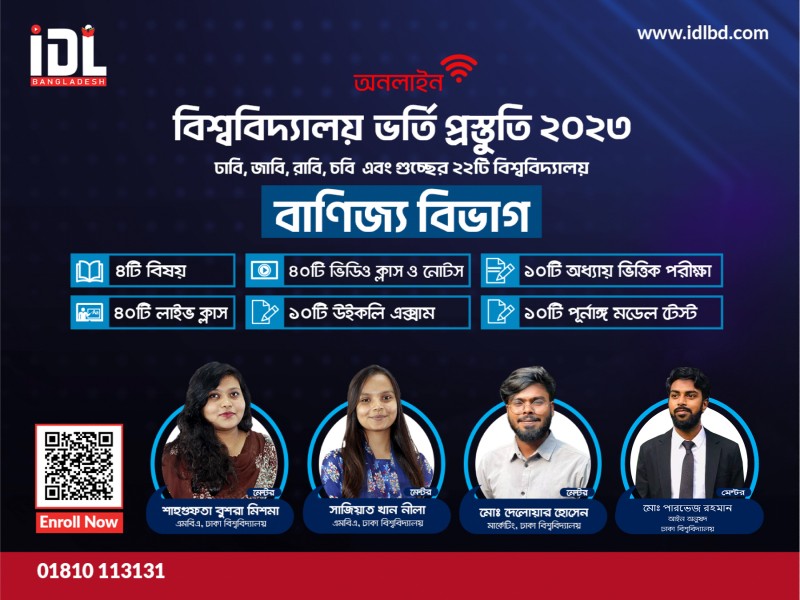 এই কোর্সটির মাধমে অনলাইন বাণিজ্য বিভাগের সম্পূর্ণ প্রস্তুতি নিতে পারবে। এখানে থাকছে ২০২৩ সালের ভর্তি পরীক্ষার সিলেবাস অনুযায়ী ইংরেজী, বাংলা ও বাণিজ্য বিভাগের ০৪টি বিষয়ে প্রস্তুতি সম্পন্ন করে রিভিশন এবং মডেল টেস্ট এর মাধ্যমে নিজেকে যাচাই করার সুযোগ। তাছাড়া, সরাসরি লাইভ ক্লাসে যুক্ত হুয়ে মেন্টরদের সাথে কথা বলে প্রশ্ন-উত্তর বুঝে নেয়ার সুযোগ।